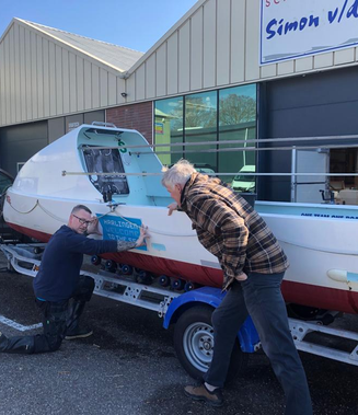 Boot van binnen en buiten goed schoon gemaakt en sponsor stickers geplaatst van;